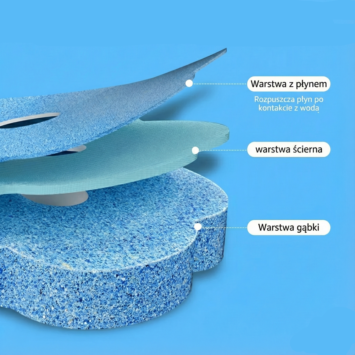 Nasze innowacyjne wkłady nasączone są skoncentrowanym płynem czyszczącym, który aktywuje się w kontakcie z wodą. Warstwa ścierna usuwa trudne zabrudzenia, a miękka gąbka poleruje powierzchnię, nie rysując ceramiki.